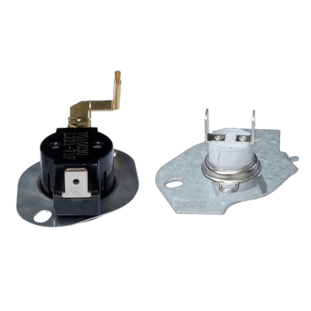 Description: This cut-off terminal is a replacement Part for specific Kenmore, Maytag, Roper, Whirlpool dryer models. The kit contains a 309°F thermal fuse and a L221-71°F high limit thermostat. In electric dryers, it shuts off the heat if overheating occurs to prevent fire risk. The thermal fuse cuts power while the thermostat regulates the operating temperature. To install, first, unplug the dryer. Use a multimeter to test the old fuse for continuity at room temperature; it should read zero ohms.